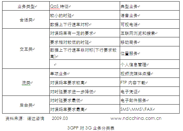 3GPP作為3G標(biāo)準(zhǔn)的研究組織,根據(jù)業(yè)務(wù)內(nèi)在技術(shù)要求把3G業(yè)務(wù)分成四類(lèi),主要包括會(huì)話類(lèi)業(yè)務(wù)、交互類(lèi)業(yè)務(wù)、流類(lèi)業(yè)務(wù)、后臺(tái)類(lèi)業(yè)務(wù)。此種劃分方法主要關(guān)注的是業(yè)務(wù)的技術(shù)質(zhì)量保證,對(duì)業(yè)務(wù)應(yīng)用、業(yè)務(wù)場(chǎng)景、業(yè)務(wù)對(duì)生活的影響關(guān)注較少,但這種分類(lèi)可以清晰的體現(xiàn)業(yè)務(wù)最底層的技術(shù)要求及業(yè)務(wù)與網(wǎng)絡(luò)相互影響。