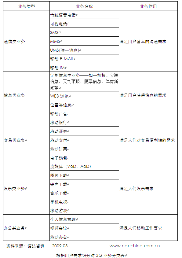 根據(jù)用戶對(duì)3G業(yè)務(wù)的體驗(yàn),其與2G業(yè)務(wù)的關(guān)系可以分為:繼承型業(yè)務(wù)(話音、SMS等)、提升型業(yè)務(wù)(移動(dòng)互聯(lián)網(wǎng)接入、POC、位置服務(wù)、移動(dòng)支付、整首歌曲下載等)、標(biāo)志型業(yè)務(wù)(可視電話、視頻流媒體點(diǎn)播直播、多媒體彩鈴、視頻會(huì)議等)