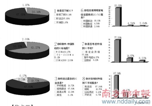 1、中國移動的3G口號是?超過98%的被訪者選擇了“引領(lǐng)3G生活”這一正確選項。2、你是否考慮升級到3G手機?選擇“會升級”的接近80%。如果考慮升級到3G手機,你最想使用哪家運營商的服務(wù)?中國移動奪得了超過九成的選票。但當(dāng)最后問到,“你印象中,中國移動的3G標(biāo)準(zhǔn)是?”時,正確選項T D -SCD M A的得票率竟只有三成左右。