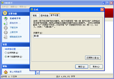 對于單個批量轉(zhuǎn)換的用戶而言,UMD舵手擁有智能斷章功能,完美解決了TXT電子書在手機(jī)上無法分章的難題。在“章節(jié)設(shè)置”選項(xiàng)卡中輸入用于制作章節(jié)目錄的關(guān)鍵字。例如:1、“第一章華山論劍”,則輸入的關(guān)鍵字可為:“第*章”;“一、華山論劍”,則輸入的關(guān)鍵字可為:“N、”;“【華山論劍】”,則輸入的關(guān)鍵字可為:“【*】”;“1-3-5節(jié):華山論劍”,則輸入關(guān)鍵字可為:“N-N-N