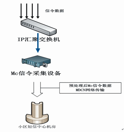 在軟交換模式下,在不影響信令傳輸?shù)那疤嵯,小區(qū)短信系統(tǒng)通過對Mc接口(MGW與MSCServer之間)進行IP數(shù)據(jù)采集,替代采集A接口七號信令數(shù)據(jù),對采集到的Mc接口數(shù)據(jù)進行分析、合成,獲取到小區(qū)短信平臺所需的重要、關(guān)鍵數(shù)據(jù)。