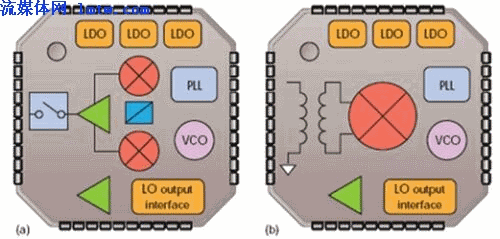 圖1:ADI的ADRF670x是一個帶PLL和VCO的發(fā)送調制器(a)。ADRF660x混頻下變頻器包括一個用于單端50Ω輸入的射頻輸入不平衡變壓器和一個帶VCO的PLL合成器(b)。這兩個器件都適用于LTE和WiMAX基站設計。