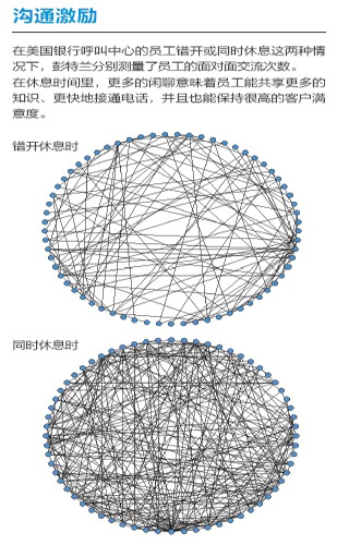 去年,彭特蘭的實(shí)驗(yàn)室與美國銀行(Bank of America)設(shè)在羅得島(Rhode Island)的呼叫中心合作,在80 名中心員工身上安裝了社會(huì)傳感器。這種傳感器看起來像一枚不顯眼的徽章,使用藍(lán)牙和紅外信號(hào)監(jiān)測(cè)實(shí)驗(yàn)對(duì)象每分鐘與哪些同事交談。測(cè)試活動(dòng)先開展了一個(gè)月,后來又進(jìn)行了6周。第一個(gè)月后,實(shí)驗(yàn)室的研究人員發(fā)現(xiàn),與更多同事進(jìn)行過交談的員工能夠更快地接通電話,他們自我感覺的壓力也相對(duì)較小,而客戶滿意度卻與其他人一樣高。與刻板地遵循員工手冊(cè)或服從經(jīng)理的電子郵件指示相比,通過非正式的閑聊來交流問題和解決方案似乎能取得更好的結(jié)果。有了這種結(jié)論之后,該呼叫中心嘗試盡量將員工的休息時(shí)間安排在一起,而非像過去那樣錯(cuò)開。這樣員工就有了更多的時(shí)間參與閑聊。幾個(gè)月后,美國銀行向?qū)嶒?yàn)室報(bào)告了結(jié)果:該呼叫中心獲得了相當(dāng)于每年1,500 萬美元的生產(chǎn)力提升。