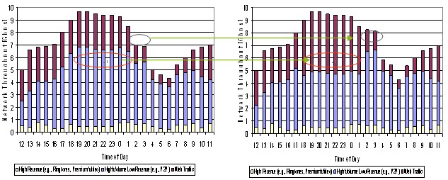合理調(diào)配資源是指應(yīng)用智能管道技術(shù),并結(jié)合激勵(lì)型市場(chǎng)定價(jià),運(yùn)營(yíng)商能夠減少網(wǎng)絡(luò)空載時(shí)間或降低低載率,在網(wǎng)絡(luò)忙時(shí)留出更多的資源給高付費(fèi)用戶和業(yè)務(wù),從而在相同的資源下獲得更高的收益。下圖是某運(yùn)營(yíng)商引入智能管道前后的數(shù)據(jù)分布效果圖,忙時(shí)高付費(fèi)業(yè)務(wù)增加,非忙時(shí)總業(yè)務(wù)量增加(主要來(lái)自于低付費(fèi)業(yè)務(wù)),這些都為運(yùn)營(yíng)商帶來(lái)了額外的收入。實(shí)際增收效果會(huì)因智能管道策略的力度和動(dòng)態(tài)調(diào)整的效果而有不同,通常都會(huì)增加幾個(gè)百分點(diǎn)甚至更高。
