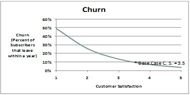 部署智能管道可以在網(wǎng)絡(luò)容量和業(yè)務(wù)保障方面產(chǎn)生積極影響。針對(duì)高端用戶提供免溢價(jià)的高價(jià)值服務(wù)/業(yè)務(wù),會(huì)提高高端用戶群體的滿意度。高端用戶是高額利潤(rùn)的保障,是所有運(yùn)營(yíng)商爭(zhēng)取的目標(biāo),而用戶滿意度是決定他們是否留在網(wǎng)絡(luò)的最重要因素。應(yīng)用智能管道后,預(yù)期年離網(wǎng)率將下降1%~2%。離網(wǎng)率的降低,將使用戶平均停留在本網(wǎng)絡(luò)的周期加長(zhǎng),從而增加收入并減少新用戶的獲取成本。這一部分的價(jià)值和意義,將大于資源合理分配和差異化業(yè)務(wù)的價(jià)值。下面的圖表顯示了離網(wǎng)率和用戶滿意度的關(guān)系。