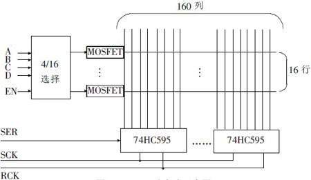 本系統(tǒng)采用行掃描方式,行選通電路由集成電路74HC154構(gòu)成。74HC154是4線-16線高性能譯碼器,在點(diǎn)陣屏幕不大的情況下,一般的單片機(jī)可以直接驅(qū)動點(diǎn)陣LED的亮滅,但是考慮擴(kuò)展為大屏幕尺寸時,因單片機(jī)的I/O口不足以提供足夠的驅(qū)動電流,但可在74HC154和點(diǎn)陣的行接口接上一個PNP型8550三極管開關(guān)電路用來提供足夠的電流,當(dāng)74HC154發(fā)出低電平時,三極管Q導(dǎo)通,輸出高電平。此外,可用帶有2級鎖存移位輸出功能的74HC595鎖存器來對列線進(jìn)行驅(qū)動控制。LED點(diǎn)陣的列線接到74HC595的8bit并行輸出口上,由單片機(jī)控制數(shù)據(jù)的輸出,利用74HC595的鎖存輸出功能,電路共用同一個移位時鐘SCK和數(shù)據(jù)鎖存時鐘RCK,可級聯(lián)多片74HC595以構(gòu)成更大LED點(diǎn)陣屏的列驅(qū)動電路。此結(jié)構(gòu)還可在75HC595的使能端通過PWM波進(jìn)行灰度調(diào)節(jié)。以一個16行×160列的LED點(diǎn)陣單元為例,本系統(tǒng)采用的驅(qū)動電路原理如圖所示。