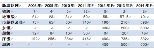 國家“十一五”規(guī)劃要求應急建設覆蓋到省級,“十二五”要求覆蓋到村級。據(jù)調研,政府省級應急平臺建設一般需2000萬元;地市級500~1000 萬元;市轄區(qū)及縣級在100萬;鄉(xiāng)鎮(zhèn)級50萬。而根據(jù)行政區(qū)域劃分,綜合指揮調度系統(tǒng)一般占應急平臺投資的5%-20%。目前,我國政府應急平臺建設覆蓋到省級、部分地市級及少量縣級,大量的縣級市及縣級、鄉(xiāng)鎮(zhèn)級并未覆蓋,而且之前的投入多以硬件系統(tǒng)集成為主,后續(xù)有很大的建設的空間。