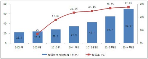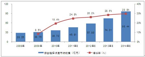根據(jù)對下游行業(yè)的調研和關聯(lián)市場的分析,2010年,中國指揮調度市場規(guī)模已達到28.1億元。隨著下游行業(yè)投資規(guī)模的擴大、產品的升級換代及技術的發(fā)展,行業(yè)市場規(guī)模將保持較快的增長速度,未來4年的復合增長率為26.31%,2014年,市場規(guī)模將達到69.8億元。