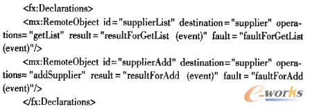 客戶層采用Flex4的Spark UI組件和ActionScript分別實現(xiàn)MVC模式的View和Control層,實現(xiàn)與系統(tǒng)用戶的交互,并通過Spring BalazeDs集成框架發(fā)布的Remote Object,實現(xiàn)與業(yè)務層對象的通訊,進而完成CRM業(yè)務處理。如下代碼為Flex中聲明Remote Object: