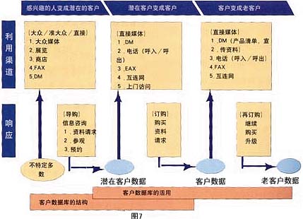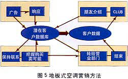 ——銷售支持:東京煤氣公司擁有三種主要的家用產品:地板式空調,煤氣暖氣及煤氣衣服干燥機。此公司于1993年開始運用數據庫營銷,現(xiàn)已取得了驕人的成果。其中主力產品——地板式空調,盡管周期長、價格高,1997年一年就銷售了3萬6千套,同時從對這些用戶調查的結果發(fā)現(xiàn)“滿意”的占96%。下面介紹一下“地板式空調”的營銷方法(見圖5)
