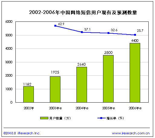 上海艾瑞市場咨詢有限公司是一家專注于網(wǎng)絡(luò)媒體、網(wǎng)絡(luò)營銷等網(wǎng)絡(luò)經(jīng)濟領(lǐng)域的專業(yè)市場調(diào)研機構(gòu)。公司近期發(fā)布《2003年中國網(wǎng)絡(luò)短信研究報告》,該報告中根據(jù)中國的網(wǎng)絡(luò)經(jīng)濟發(fā)展情況預(yù)測:2003年中國網(wǎng)絡(luò)短信用戶將達到1925萬,2004年將達到2640萬。