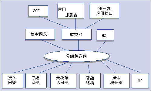 接入層包括各種接入網(wǎng)關(guān)、中繼網(wǎng)關(guān)、無線接入網(wǎng)關(guān)、智能終端以及與處理媒體有關(guān)的媒體服務(wù)器和多點處理器(MP)。傳送層包括提供IP包轉(zhuǎn)發(fā)的各種承載網(wǎng)功能實體。控制層是NGN網(wǎng)絡(luò)的核心,主要包括軟交換設(shè)備、信令網(wǎng)關(guān)和多點處理器。業(yè)務(wù)層則主要包括應(yīng)用服務(wù)器、第三方應(yīng)用接口和傳統(tǒng)智能網(wǎng)功能。該業(yè)務(wù)層通過開放的業(yè)務(wù)層接口向用戶提供傳統(tǒng)智能網(wǎng)業(yè)務(wù)、多樣化的第三方業(yè)務(wù)和增值業(yè)務(wù)。