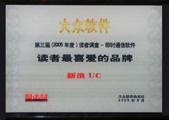 8月24日,在國(guó)內(nèi)知名IT媒體《大眾軟件》創(chuàng)刊10周年慶典上,《大眾軟件》隆重公布了“《大眾軟件》第三屆(2005年度)讀者調(diào)查報(bào)告”,新浪UC以12.20%的市場(chǎng)占有率,逼近排名第二的MSN(17.81%),實(shí)至名歸在國(guó)內(nèi)IM市場(chǎng)獲得第三的成績(jī),并獲得《大眾軟件》頒發(fā)的“第三屆(2005年度)讀者調(diào)查——即時(shí)通訊軟件”市場(chǎng)“讀者最喜愛(ài)的品牌”(圖一)。