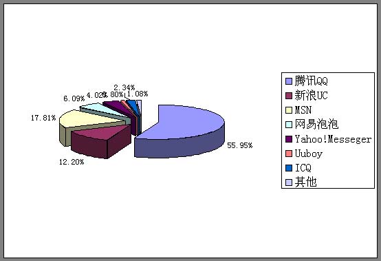 根據(jù)本次報(bào)告的“即時(shí)通信軟件使用情況分析”,新浪UC僅比排名第二的MSN相差5個(gè)百分點(diǎn),并以超過(guò)一倍的相當(dāng)優(yōu)勢(shì)超越排名第四、第五的其他IM軟件。至此,國(guó)內(nèi)IM領(lǐng)域已經(jīng)形成了以騰訊QQ、微軟MSN、新浪UC三大巨頭“瓜分天下”的格局,三者之和牢牢掌控了國(guó)內(nèi)IM領(lǐng)域?qū)⒔?6%以上的市場(chǎng)份額(圖二)。