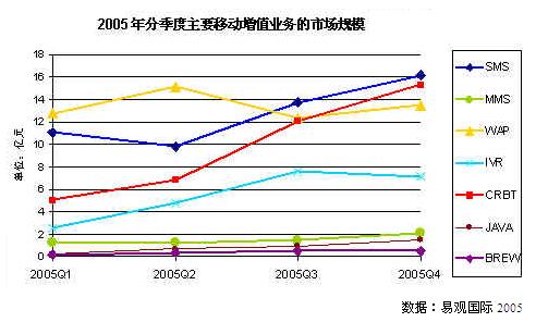 2005年分季度主要移動增值業(yè)務(wù)的市場規(guī)模圖