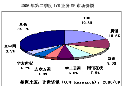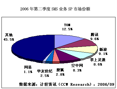 計世資訊(CCW Research)調(diào)研顯示。2006年第二季度,中國SMS業(yè)務市場規(guī)模達到118.3億元人民幣,其中SP收入12.1億元人民幣。TOM、騰訊和新浪排名前三位,分別占12.5%、9.6%和9.1%。其次為掌上靈通和空中網(wǎng),占8.6%和8.3%。