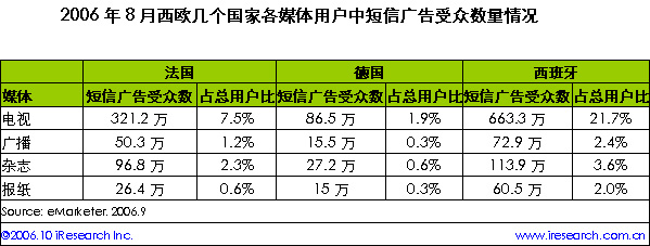 iResearch艾瑞市場(chǎng)咨詢根據(jù)eMarketer資料整理顯示,短信廣告在西歐國家大行其道,成百上千萬的移動(dòng)用戶訂閱了廣告短信。西歐各國不同媒體訂閱廣告短信的用戶數(shù)不盡相同?傮w上來看,西班牙的短信廣告受眾最多,電視用戶中有21.7%人訂閱了短信廣告,數(shù)量達(dá)663.3萬。相比之下,法國電視用戶中的短信廣告受眾只有西班牙的1/2,德國則更少。