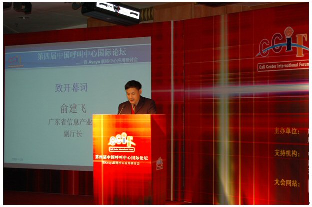 由廣東省信息協(xié)會(huì)、廣東省電子商務(wù)協(xié)會(huì)聯(lián)合主辦,廣東省信息協(xié)會(huì)客戶(hù)服務(wù)專(zhuān)業(yè)委員會(huì)、廣州市品派文化傳播有限公司策劃承辦,AVAYA公司總協(xié)辦的第四屆中國(guó)呼叫中心國(guó)際論壇于2007年1月23日在廣州亞洲國(guó)際大酒店隆重舉行,廣東省信息產(chǎn)業(yè)廳副廳長(zhǎng)俞建飛出席會(huì)議并致開(kāi)幕詞。會(huì)上,廣東省信息協(xié)會(huì)秘書(shū)長(zhǎng)黃觀輝、AVAYA公司銷(xiāo)售總經(jīng)理?xiàng)畛、民生銀行電子銀行部華南運(yùn)營(yíng)中心總經(jīng)理李濤、網(wǎng)易客戶(hù)服務(wù)部總監(jiān)張?jiān)频确謩e做了主題發(fā)言。來(lái)自全國(guó)各地300多位企業(yè)管理人員參加了本次論壇。