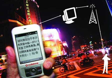 (發(fā)條短信即可鎖定手機用戶行蹤示意圖。)