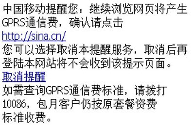 從2007年5月17日起,通過(guò)手機(jī)訪(fǎng)問(wèn)WAP網(wǎng)站,中國(guó)移動(dòng)向用戶(hù)主動(dòng)提供一個(gè)收費(fèi)提示頁(yè)面,提醒用戶(hù)“正在使用手機(jī)上網(wǎng)業(yè)務(wù),若繼續(xù)瀏覽網(wǎng)頁(yè),將會(huì)產(chǎn)生GPRS通信費(fèi)”。但打開(kāi)中國(guó)移動(dòng)夢(mèng)網(wǎng)頁(yè)面,則不會(huì)有上述提示。