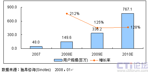 馳昂咨詢(Sinotes)發(fā)布的《2007-2008年中國3G后視頻應用市場研究報告》顯示,2007年,中國視頻應用市場規(guī)模為233.7億元,比2006年同期增長了84%,用戶規(guī)模近4800萬,比2006年的2300萬翻了一番。馳昂咨詢的分析師孟慶雯認為,這主要得益于產(chǎn)業(yè)鏈各方在利用現(xiàn)有2.5G/2.75G網(wǎng)絡開展視頻應用服務上做的有益嘗試。產(chǎn)業(yè)鏈各方的努力加快了3G視頻應用市場培育步伐,基本滿足了在現(xiàn)有網(wǎng)絡條件下用戶對視頻服務的需求,確保了由2.5G/2.75G向3G的業(yè)務銜接和過渡。