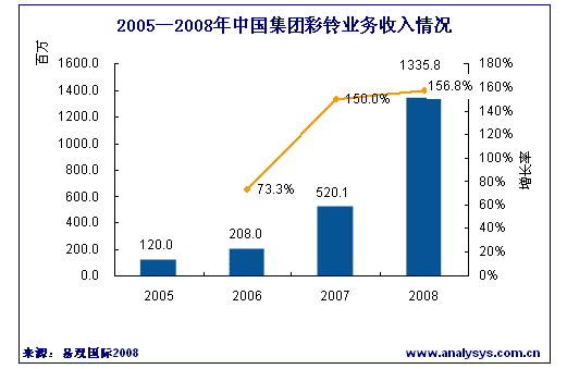 中國(guó)集團(tuán)彩鈴業(yè)務(wù)2008年市場(chǎng)收益將達(dá)13.6億元