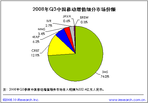 根據(jù)iResearch艾瑞咨詢最新出版的《2008年第三季度中國移動增值行業(yè)發(fā)展報告》數(shù)據(jù)顯示,2008年第三季度中國移動增值服務(wù)市場規(guī)模達(dá)332.4億元,同比增長40.2%.其中短信市場規(guī)模以74.0%的比例位居第一,CRBT和WAP分別以12.9%和6.2%的份額居第二、第三。