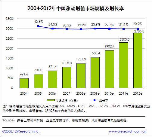 根據iResearch艾瑞咨詢即將推出的《2008-2009年中國移動互聯(lián)網行業(yè)發(fā)展報告》統(tǒng)計,2008年中國移動增值市場規(guī)模達1251.3億人民幣(約合183.2億美元),相比2007年的1050億人民幣年同比僅增長19.2%,相比2007年增速放緩。(中國移動增值市場規(guī)模定義為用戶為各項移動增值業(yè)務付費總和)