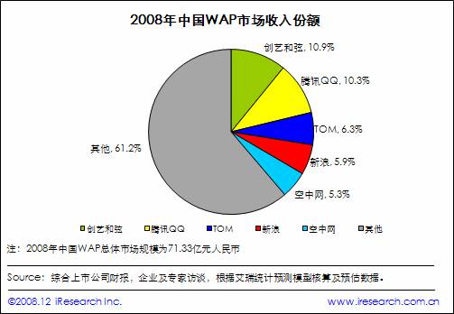 艾瑞咨詢研究發(fā)現(xiàn),08年WAP市場集中度較2007年有所提升,TOP5廠商占據份額已達38.8%,其中創(chuàng)意和弦、騰訊QQ、TOM分別以10.9%、10.3%和6.3%的比例位居前三。
