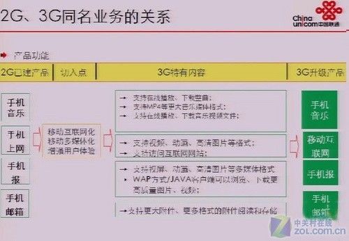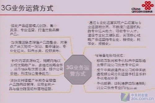 前不久,有論壇網(wǎng)友曝光了幾張聯(lián)通內部3G培訓所用的PPT截圖,其中不僅提到了聯(lián)通3G業(yè)務的運營方式,2G/3G同名業(yè)務的關系,還再一次強調了聯(lián)通將重點推廣的3類九項主要3G業(yè)務。這和筆者前段時間為大家曝光的《官方Flash動畫:解析聯(lián)通3G九大特色業(yè)務》所提到的聯(lián)通9大特色3G業(yè)務保持一致。