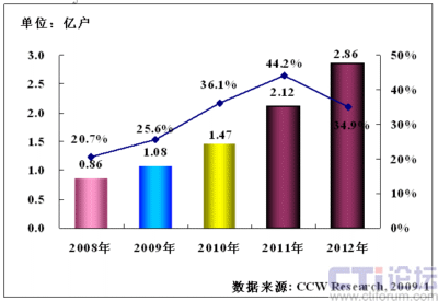 計(jì)世資訊(CCW Research)研究預(yù)測,2009年中國移動(dòng)支付用戶數(shù)將達(dá)到1.08億戶,其同比增長率將達(dá)到25.6%,預(yù)計(jì)2010年中國移動(dòng)支付用戶數(shù)將達(dá)到1.47億戶,其同比增長率將達(dá)到36.1%,2011年中國移動(dòng)支付用戶數(shù)將達(dá)到2.12億戶,其同比增長率將達(dá)到44.2%,2012年中國移動(dòng)支付用戶數(shù)將達(dá)到2.86億戶,其同比增長率將達(dá)到34.9%。