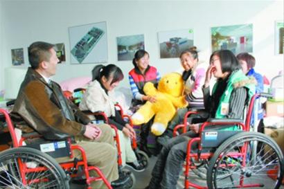 劉淼轉(zhuǎn)動(dòng)著輪椅在無(wú)障礙辦公區(qū)自如地穿行,記者隨著她參觀(guān)了就業(yè)基地。 “這份工作對(duì)于我們這些殘疾人來(lái)說(shuō),就像椅子上的陽(yáng)光;我們不但心中充滿(mǎn)陽(yáng)光,還要把我們心中的陽(yáng)光傳遞給客戶(hù),給他們以溫暖的感受!闭f(shuō)這些話(huà)時(shí),劉淼一直微笑著。