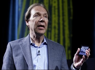 圖:Sprint CEO丹·海斯(Dan Hesse)在美國(guó)無(wú)線通信展上展示宏達(dá)電新手機(jī)Evo 4G