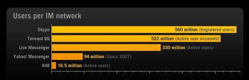 用戶最多的即時(shí)通訊工具包括:Skype(5.6億注冊(cè)用戶)、騰訊QQ(5.22億活躍用戶帳戶)、MSN(3.3億活躍用戶)、雅虎通(9400萬用戶--2007年數(shù)據(jù))。