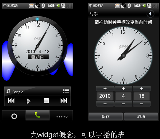 第三,引入大widget概念。Widget給用戶(hù)提供了簡(jiǎn)易接口來(lái)執(zhí)行一些常用功能。OPhone2.0版本首次引入了大widget概念,將手機(jī)人性化操作提升到了新的高度。譬如,手機(jī)最簡(jiǎn)單也是最常用的顯示時(shí)間功能,就在OPhone2.0中被設(shè)計(jì)成了一個(gè)“可以用手播動(dòng)的表”,用戶(hù)不必再繁瑣地輸入數(shù)字來(lái)修改時(shí)間。