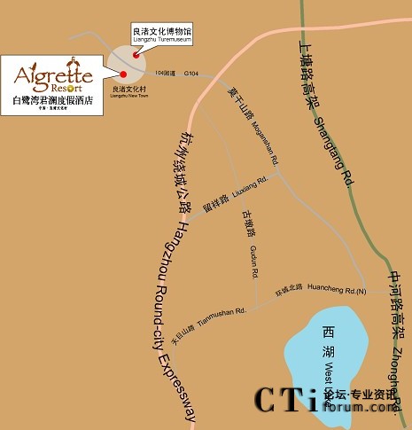 杭州城站火車站——西湖大道(入口)——中和路高架(出口)——勾運(yùn)路——莫干山路(過勾莊收費(fèi)站)——新104國道(大陸出口)——良渚文化村——杭州白鷺灣君瀾度假酒店