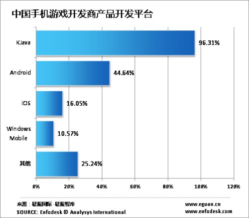 根據(jù)易觀國際的數(shù)據(jù)顯示,截至2010年底,中國手機游戲用戶規(guī)模突破1.3億,同比增長52.11%,同期中國手機游戲市場規(guī)模達33億,伴隨著整體市場的發(fā)展手機游戲開發(fā)商隊伍也逐漸完善;為了更好的研究手機游戲市場,近期易觀國際對手機游戲開發(fā)商進行調研,推出《中國手機游戲開發(fā)商研究報告2010》,以期對手機游戲市場提供有價值的信息,通過調研發(fā)現(xiàn)KJava依舊是中國手機游戲開發(fā)商的主要開發(fā)平臺。