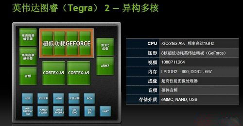 而英偉達(dá)圖睿Tegra 2就是專為移動(dòng)市場(chǎng)而設(shè)計(jì)的超級(jí)芯片,Tegra 2雙核處理器采用了40納米工藝制程,有兩顆Cortex-A9處理器,主頻高達(dá)1GHz。Tegra 2處理器芯片只有1/4個(gè)硬幣大小,雙核以更低的功耗實(shí)現(xiàn)同等性能,多任務(wù)處理速度提升一倍,尤其是處理Flash以及HTML5的速度最快。