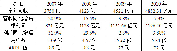 中國(guó)移動(dòng)2007年-2010年年度業(yè)績(jī)對(duì)比