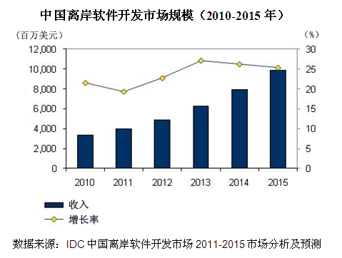 IDC數(shù)據(jù)顯示,2010年中國離岸軟件開發(fā)市場規(guī)模達(dá)到33.57億美元,同比增長21.6%,預(yù)計(jì)未來五年將以24.2% 的復(fù)合增長率快速攀升。