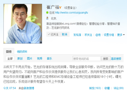 7月12日上午消息,因遭遇存儲(chǔ)故障,從昨日下午2時(shí)起,提供在線服務(wù)的旅游網(wǎng)站藝龍開(kāi)始無(wú)法訪問(wèn),截至目前已經(jīng)過(guò)去了20個(gè)小時(shí)。藝龍CEO崔廣福通過(guò)新浪微博表示,藝龍工程師和EMC存儲(chǔ)工程師正在緊張搶修中,預(yù)計(jì)今天上午能夠恢復(fù)正常。新浪科技