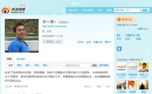 李一男(微博)宣布將辭去無(wú)限訊奇CEO職務(wù)