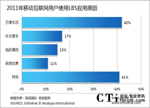 CTI論壇(ctiforum)8月26日消息(記者 張潔):根據(jù)易觀國(guó)際(Analysys international)最新調(diào)研顯示,42%的使用LBS用戶認(rèn)為使用應(yīng)用程序可以方便生活,17%的用戶認(rèn)為是社交需求,15%的用戶只是出于追趕潮流的目的,11%的用戶認(rèn)為使用LBS應(yīng)用程序可以獲得一定的優(yōu)惠。