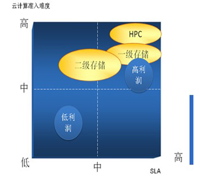從企業(yè)戰(zhàn)略咨詢分析師的角度,我認為IBM的戰(zhàn)略布局和資源整合策略確實是IT領(lǐng)域戰(zhàn)略規(guī)劃很好的教科書(起碼對于我個人而言)。精準的定位市場、以具有明顯技術(shù)細分優(yōu)勢的產(chǎn)品或服務(wù)切入市場、設(shè)定較高的技術(shù)準入門檻,這些戰(zhàn)略舉措不僅有助于IBM快速占領(lǐng)新生市場戰(zhàn)略制高點,同時保證了其可持續(xù)競爭優(yōu)勢和利潤空間。從下面的云計算準入/云服務(wù)SLA象限圖上,當(dāng)很多廠商還在考慮“哪塊云彩有雨”時,IBM已經(jīng)完成在云端提供HPC和高增值二級存儲服務(wù)的布局,掌控了利潤最豐厚的云計算高端市場。從我個人的預(yù)測,IBM在云端提供一級存儲服務(wù),應(yīng)該是其云計算高端戰(zhàn)略的下一個布局。