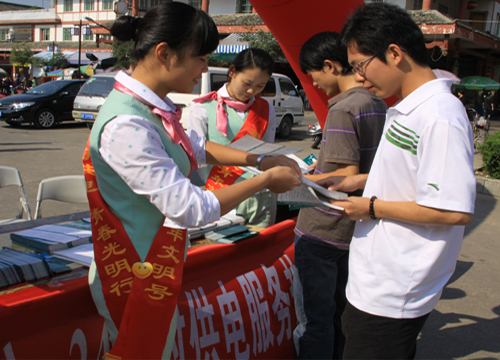 “你們服務(wù)真周到、真方便,讓我們?cè)谏⒉降耐瑫r(shí)就可以了解到有關(guān)電力法規(guī)、服務(wù)項(xiàng)目等知識(shí),太好了!10月22日,在福建長(zhǎng)汀三元閣廣場(chǎng),正在散步的張女士滿(mǎn)意地贊揚(yáng)了長(zhǎng)汀供電服務(wù)宣傳隊(duì)的姑娘們。