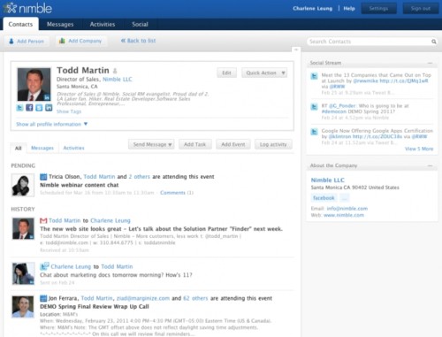 在一切皆可社會化的今天,客戶關(guān)系管理(CRM)服務(wù)的社交色彩也開始變得越來越濃。該領(lǐng)域內(nèi)的創(chuàng)業(yè)公司Nimble最近升級了它們的服務(wù),升級后的Nimble 2.0版更加強調(diào)社交信息的聚合管理,試圖給側(cè)重“信息輸入”的CRM服務(wù)領(lǐng)域帶來新變化。