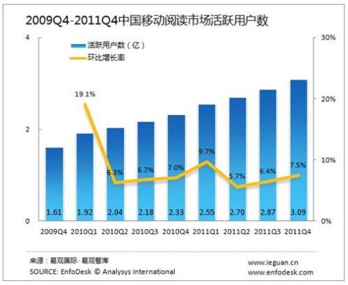 2011年第4季度中國手機(jī)閱讀活躍用戶突破3億