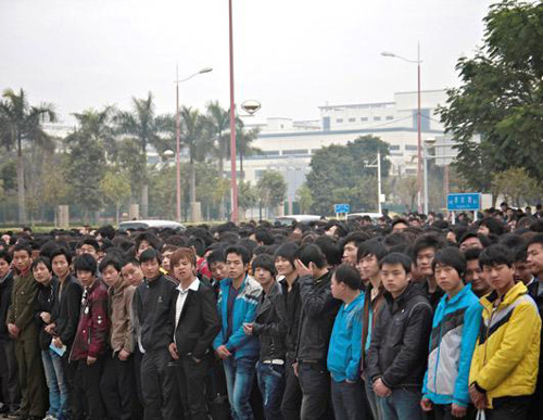在一個(gè)周一上午,約3000名外來工人在深圳的富士康招聘中心門前,希望獲得在富士康的工作機(jī)會(huì)。