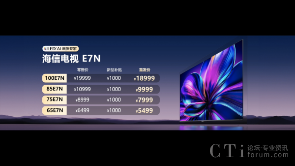 海信AI電視E7N提供了65/75/85/100吋四個(gè)版本,零售價(jià)分別是6499元、8999元、10999元、19999元,首發(fā)享受體驗(yàn)金1000元,到手價(jià)5499元、7999元、9999元、18999元,9月29日0點(diǎn)正式開售;同時(shí)享受3000元政企雙補(bǔ)(2000元1級(jí)能效政府至高補(bǔ)貼+1000元企業(yè)至高補(bǔ)貼),以及6000元套購(gòu)補(bǔ)貼(海信品質(zhì)家電全套購(gòu),滿額至高再補(bǔ)貼6000元)。