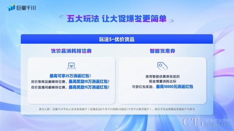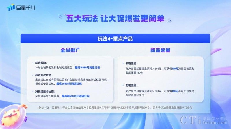 四、「重點產(chǎn)品玩法」:「全域推廣」和「新品起量」兩個巨量千川平臺重點產(chǎn)品,也推出了系列玩法。全域推廣對新客、完成有效測試的客戶發(fā)放全域推廣專屬紅包,最高達(dá)28888元,參與全域增長消耗排位賽也可獲得高達(dá)50000元的消返紅包。新品起量基準(zhǔn)期新客現(xiàn)金消耗≥300元,可獲得100元消返紅包獎勵,老客現(xiàn)金消耗≥500元,即可得到100元消返紅包獎勵。